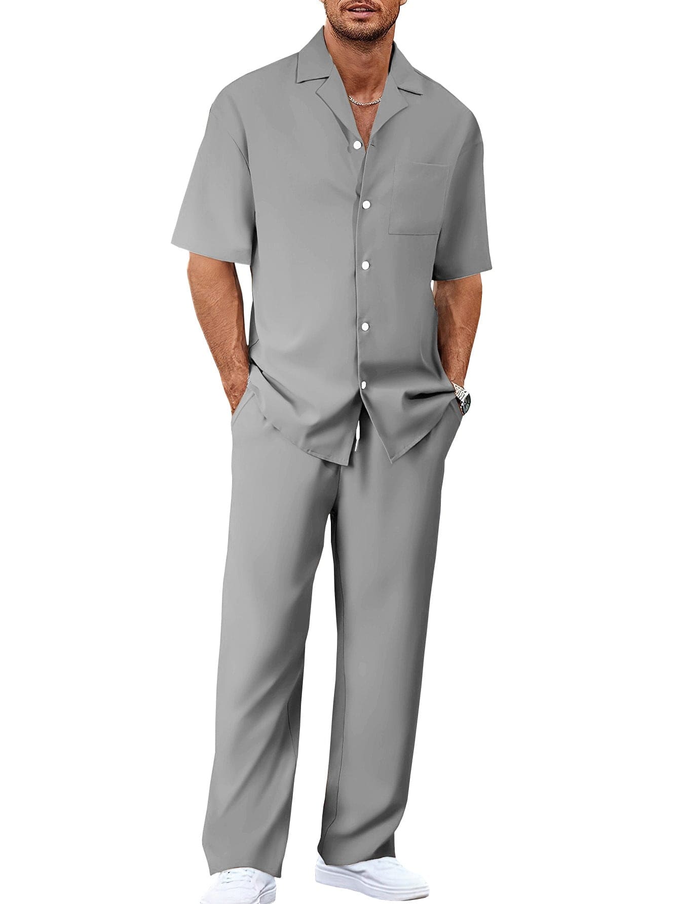 •  Stylish 2-piece casual outfit featuring a short-sleeve shirt and matching trousers